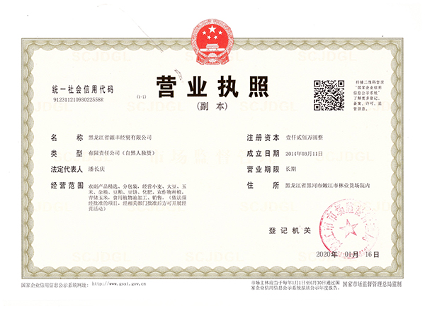 黑龍江省源豐經(jīng)貿(mào)有限公司成立于2014年3月,位于黑 龍江省嫩江市中心城區(qū)東部(省級(jí)嫩江經(jīng)濟(jì)開(kāi)發(fā)區(qū)新規(guī)劃范圍 內(nèi)),公司注冊(cè)資金1200萬(wàn)元,占地面積3萬(wàn)平方米,是一家 集糧食收購(gòu)、儲(chǔ)存、加工、銷(xiāo)售、大豆進(jìn)口、有機(jī)認(rèn)證、貨物運(yùn)輸 為一體的綜合型糧貿(mào)企業(yè)。公司創(chuàng)建“嫩源豐”品牌已成為黑 龍江省知名產(chǎn)品,產(chǎn)品已銷(xiāo)售覆蓋全國(guó)各地。目前,公司共有 員工25人(董事長(zhǎng)1人、經(jīng)理1人、會(huì)計(jì)2人、出納1人、保管 員2人、化驗(yàn)員3人、工人10人、臨時(shí)工人5人),公司內(nèi)設(shè)綜合 部、倉(cāng)儲(chǔ)部、購(gòu)銷(xiāo)部、質(zhì)檢部、財(cái)務(wù)部等6個(gè)部門(mén),全部按照 現(xiàn)代企業(yè)制度進(jìn)行管理。2023年公司年糧食銷(xiāo)售6萬(wàn)噸,認(rèn) 證有機(jī)大豆3605噸、有機(jī)黑豆1200噸,平均年?duì)I業(yè)收入約2億元,已發(fā)展成為嫩江市著名糧食購(gòu)銷(xiāo)企業(yè)。